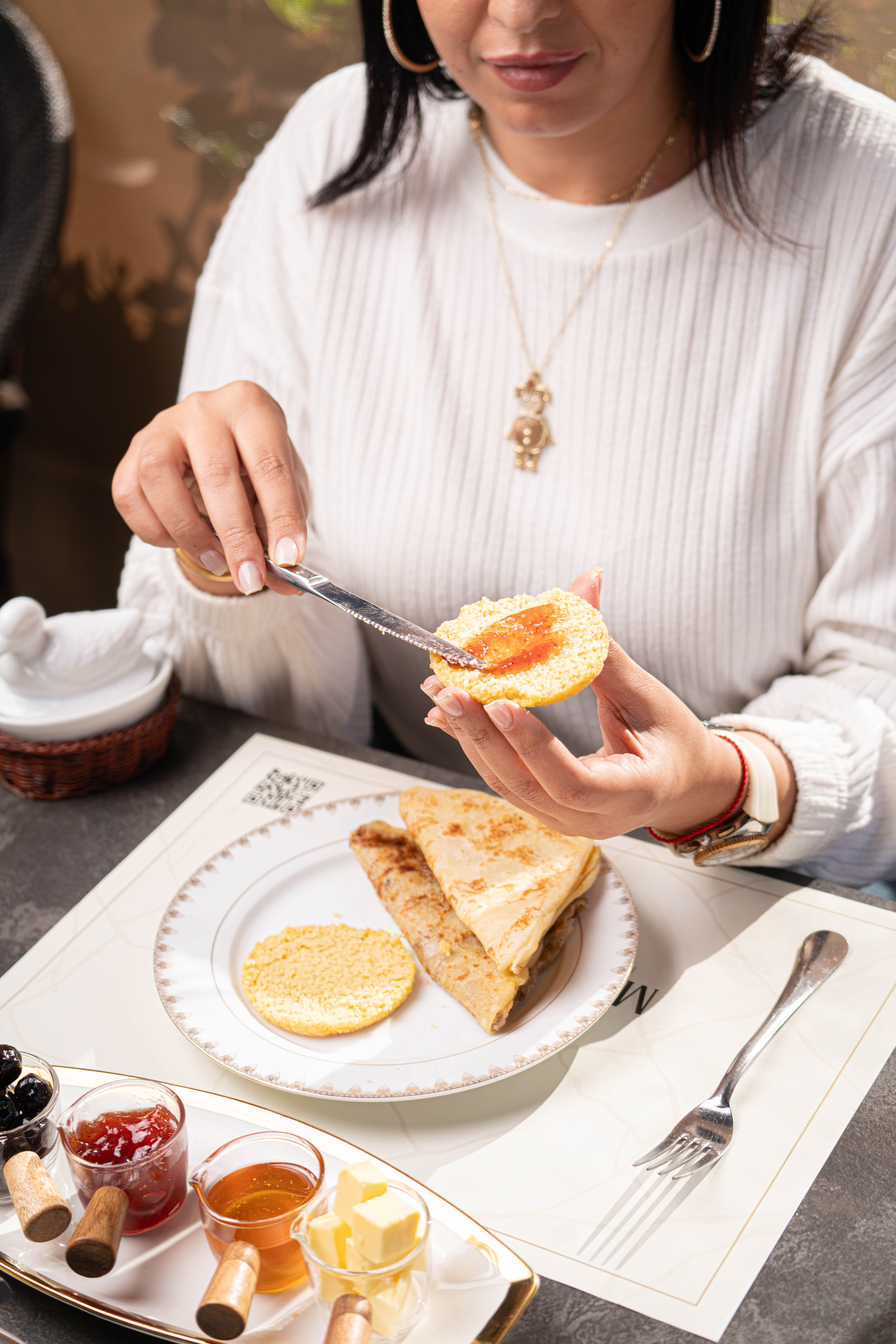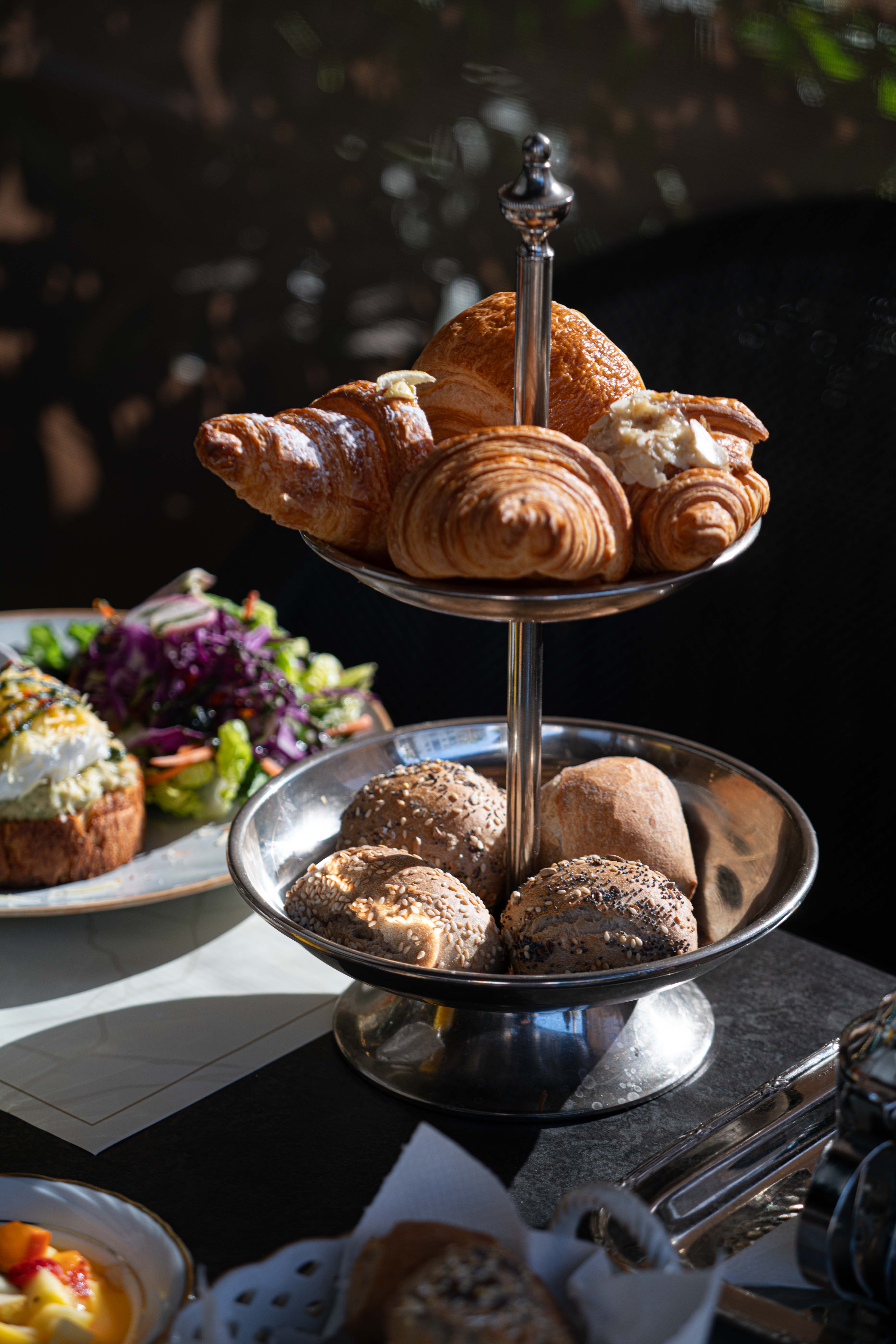 Choice of hot drink: Espresso, Americano, Hot Chocolate, Latte, Cappuccino, or Mint Tea. Orange or carrot juice. Gourmet pancakes, Salted butter caramel. Chia Pudding. Basket of small loaves (or rolls) Served with: Jam, Honey, Butter. Eggs Benedict with your choice: